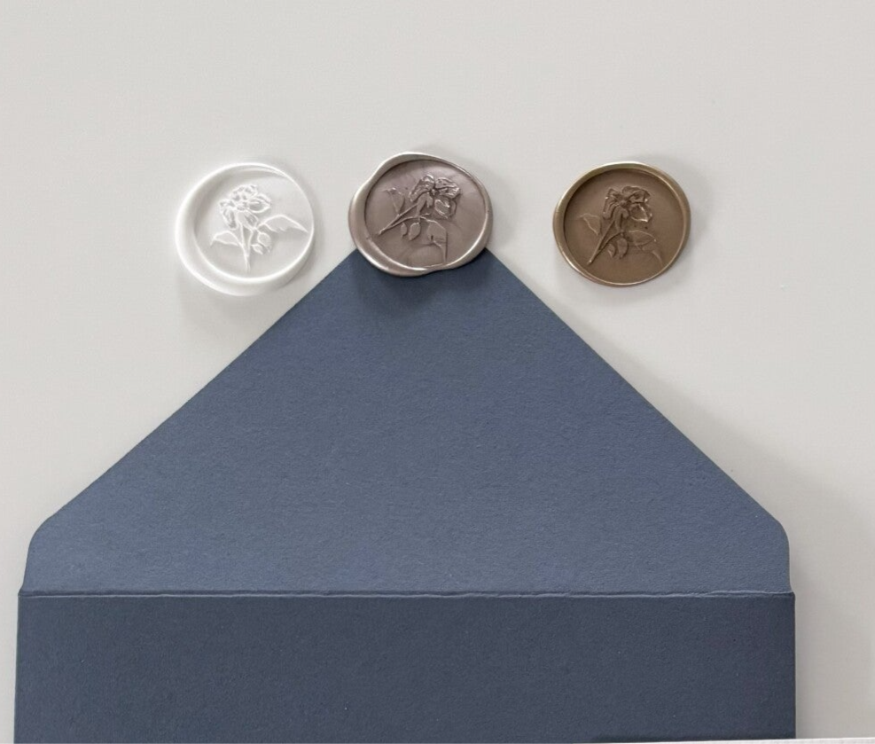Ci sono 3 modelli di timbro disponibili (rosa, foglia, corona); è anche possibile chiedere la realizzazione di un timbro personalizzato che una volta acquistato resterà a voi.